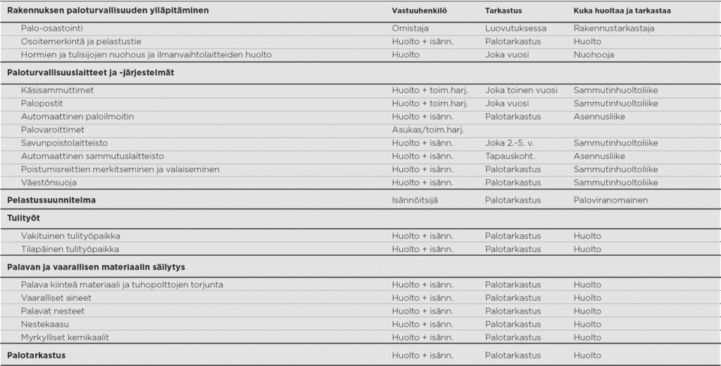 Kiinteistön paloturvallisuuteen vaikuttavat asiat, vastuuhenkilöt sekä tarkastus- ja huoltotiheydet