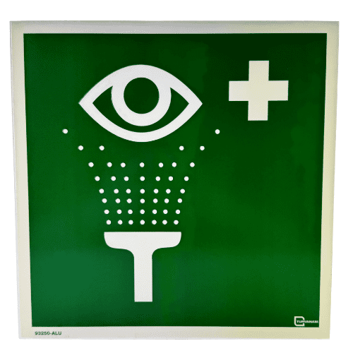 Silmänhuuhtelu 250×250 mm, yksipuolinen jälkivalaistu alumiinikilpi.